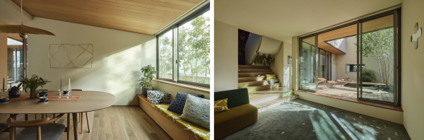 右:中庭を介して家族の気配を感じる木漏れ日のリビング