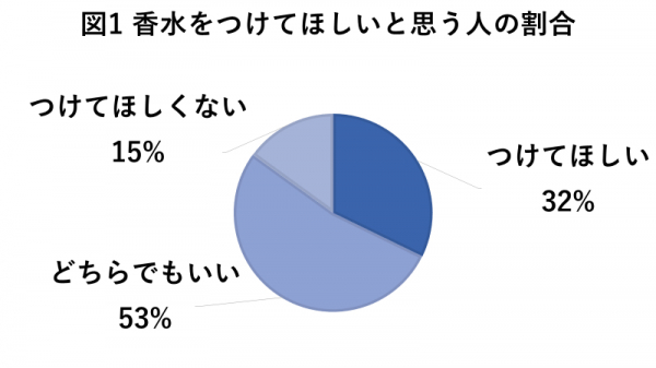 結果、女性に香水を「つけてほしい」と思う方は全体のうち32%、「どちらでもいい」と回答した方は53%、「つけてほしくない」と答えた方は15%。つけてほしくない男性は少数派であることが分かりました。