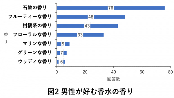 女性がつける香水の中で最も男性から好まれていた香りは「石鹸の香り」。次いで「フルーティーな香り」、「柑橘系の香り」、「フローラルな香り」が上位にランクインしました。