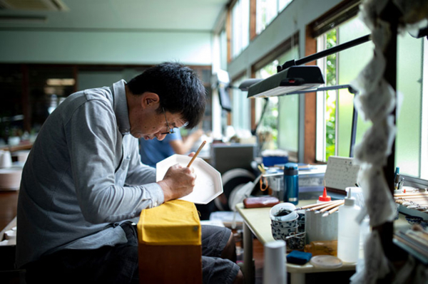 染付にこだわりはじめたのは、15年前くらいから。先人たちの仕事を研究し、参考にするようになってきました。染付は初代清風与平(せいふうよへい)。細い線の技術は、三川内焼の名工で「三猿(さんえん)」と呼ばれた中里巳牛太(みまた)です。この二人の圧倒的な影響を重圧に感じながら目標としています。