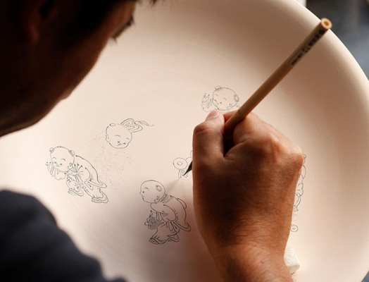松山窯の得意とする絵柄は、ふっくらとした愛らしい唐子絵、細密な青海波文様、モダンな唐草文様等がありますが、「新しい伝統」も着実に育まれています。
