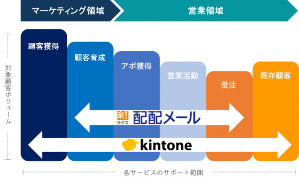 また、これまでExcel等で個別に顧客管理をしていた企業においては、「kintone」と「配配メール」、さらに「配配メールコネクタ」をセットで導入することで、点在していた顧客データを「kintone」上で一元管理し、営業活動の進捗状況を社内で共有しながら、メールを起点とした顧客へのアプローチを手間なく効率的に行うことが可能になります。