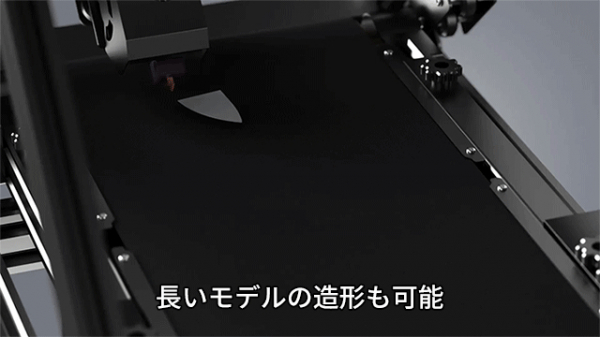 高品質のナイロンコンベアーベルトを採用。Z軸方向に長さ無制限に印刷できます。剣に似た模型など、ボックス型の3Dプリンターでは不可能だった長物モデルの造形が可能です。
