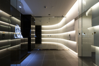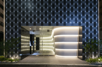 当社が開発する投資用ワンルームマンション「アジールコート」では敷地の特性、空間に応じて一棟一棟テーマを変えてエントランスをつくっています。2020年竣工の新高円寺プロジェクトのエントランスでは、内外を連続する柔らかな曲面壁でマンションの来訪者の視線を自然に建物内部へと導き、約2.8メートルの高い天井高を活かしたドレープ状の壁と間接照明が幾重にも重なり陰影を作るデザインとし、外部の光のラインと呼応するデザインを志向しました。