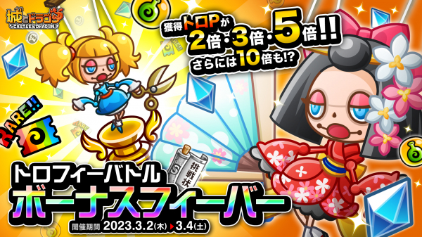 株式会社アソビズム(本社:東京都千代田区、代表取締役:大手智之)は、App Store・Google Playにて好評配信中の『城とドラゴン』で、「トロフィーバトル ボーナスフィーバー」を2023年3月2日(木)より開催いたします。