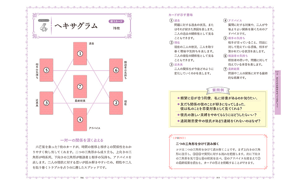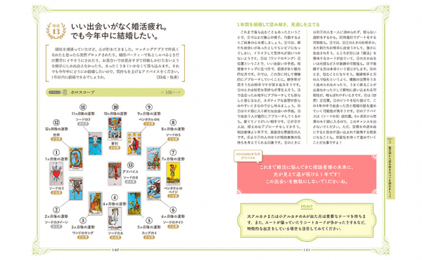 年の差、復活愛、社内恋愛などの関係性の悩みから、LGBT、マッチングアプリといった現代ならではの悩みなど、相手の気持ちや恋の行方を占う上で出てくる悩みを解決するためのリーディング例を多数掲載しています。