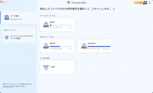 手順1.Tenorshare 4DDiG(Mac)をインストール、プログラムを起動させます。