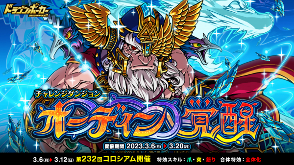 3月6日(月)より、チャレンジダンジョン「オーディン覚醒」を復刻開催いたします。本ダンジョンでは、覚醒した「オーディン」がボスモンスターとして登場!ダンジョンで覚醒進化素材を手に入れ、モンスターを覚醒させましょう!