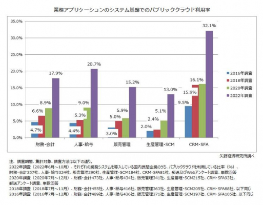 各領域で前回(2020年)調査の利用率と比較すると、財務・会計で2020年8.9%→2022年17.9%、人事・給与で同9.0%→同20.7%、販売管理で同5.9%→同15.2%、生産管理・SCMで同5.1%→同13.0%、CRM・SFAで同16.1%→同32.1%となった。2016年調査からの利用率の推移を見ても、近年、システム基盤としてパブリッククラウドの利用が加速していることがわかる。
