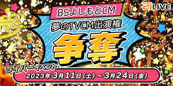 株式会社エムアンドティーティー(本社:沖縄県北谷町、代表取締役:井藤 三知子)が運営するエンターテイメント・ライブ配信アプリ【21LIVE(ニーイチライブ)】URL: https://21.live では、3月11日(土)から3月24日(金)までBSよしもとで放映するテレビCMの出演権を賭けたランキングイベントを開催いたします。