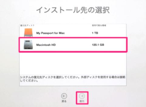 (7)バックアップするMac上のハードディスクを選択し、「復元」をクリックします。完了したら、Macを再起動します。