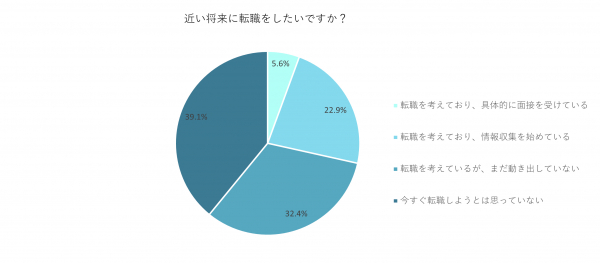 「転職を考えており、具体的に面接を受けている」5.6%、「転職を考えており、情報収集を始めている」22.9%、「転職を考えているが、まだ動き出していない」32.4%、「今すぐ転職しようとは思っていない」39.1%という結果でした。