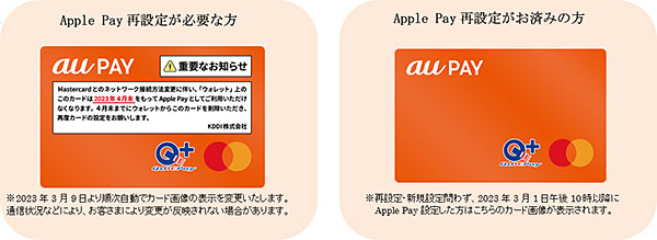 Mastercard社のネットワーク接続方法変更に伴い、2023年3月1日午後6時より前にau PAY プリペイドカードでApple Payを設定したお客さまは、カード情報の再設定が必要となります。
