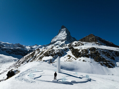 コラボレーションの開始を記念して、Daniel Arsham氏はウブロにインスパイアされた20mの日時計を標高2583mのシュヴァルツゼーを望むツェルマットの雪景色の中に制作しました。