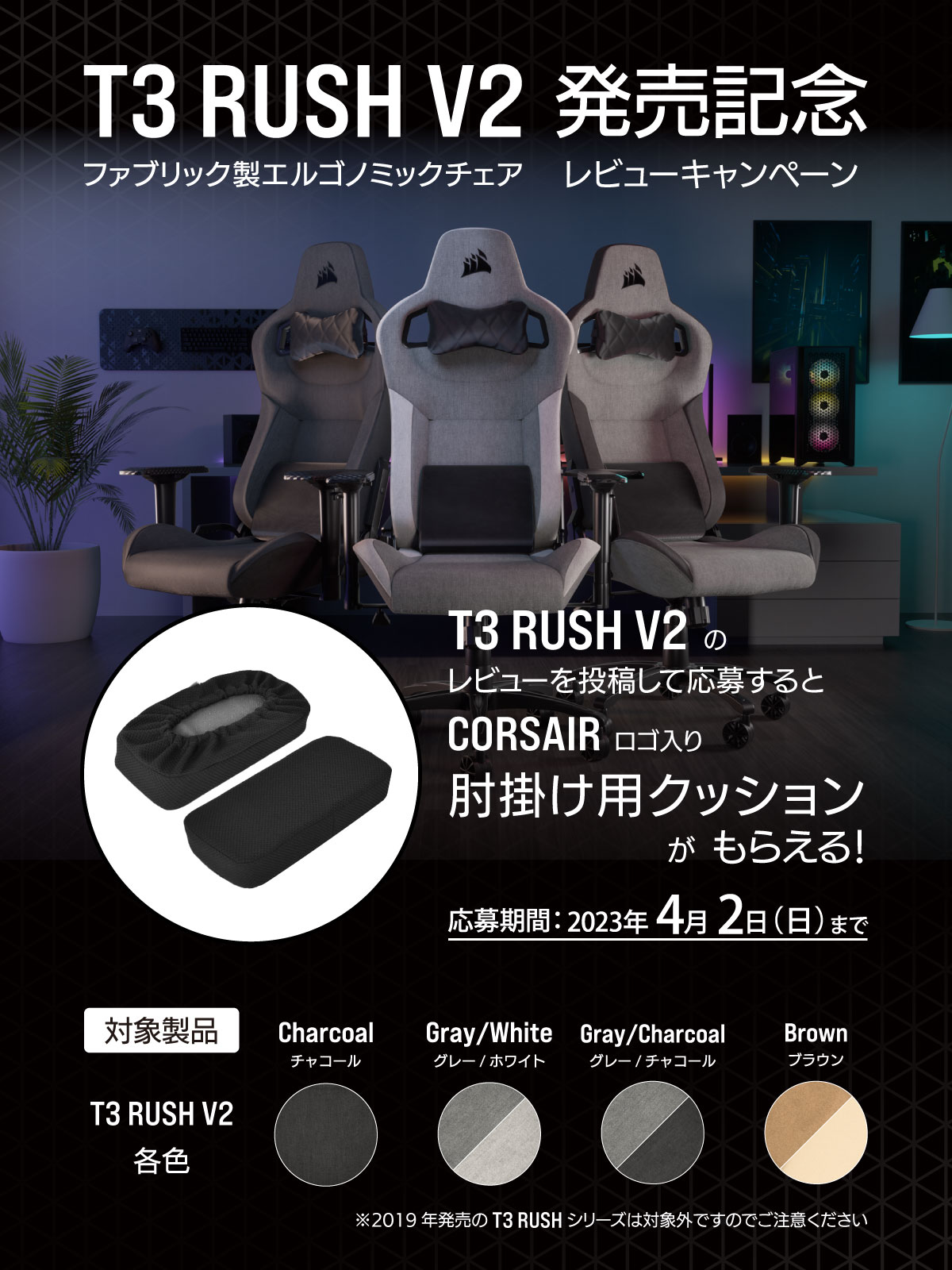 株式会社リンクスインターナショナル(本社:東京都千代田区、代表取締役:川島義之)は、CORSAIR製人気ゲーミングチェアのリニューアルモデル「T3 RUSH V2」をレビューするとCORSAIR国内限定グッズのロゴ入り肘掛け用クッションがもらえる、「CORSAIR T3 RUSH V2 レビューキャンペーン」を2023年3月8日~4月2日まで開催いたします。