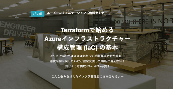 株式会社エーピーコミュニケーションズは、2023年3月23日(木)に無料ウェビナー「Terraformで始めるAzureインフラストラクチャー構成管理 (IaC) の基本」を開催いたします。