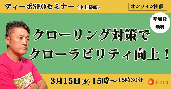 SEO対策サービスの開発・販売を行っている株式会社ディーボ(札幌市、代表取締役社長:藤沢 竜志、以下:ディーボ)は、2023年3月15日(水)15時からSEO中上級編となるSEO対策セミナー第4回目を開催します。