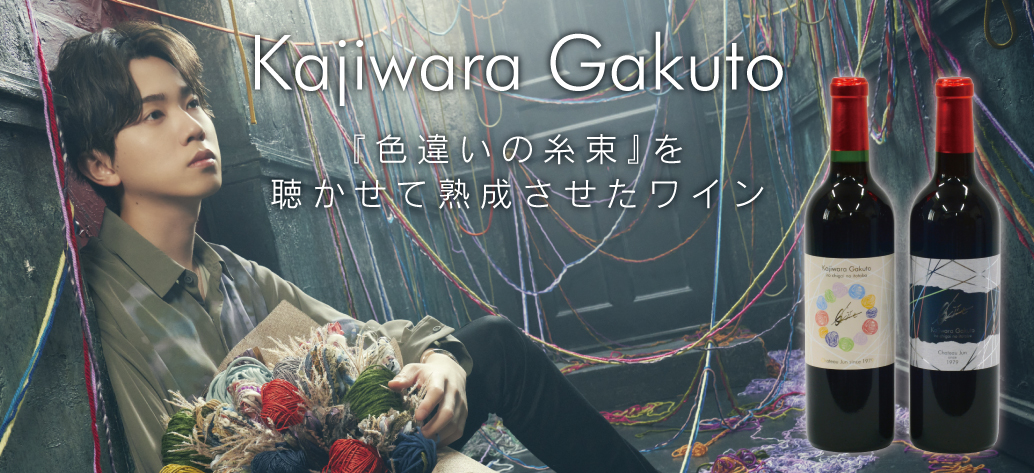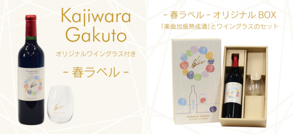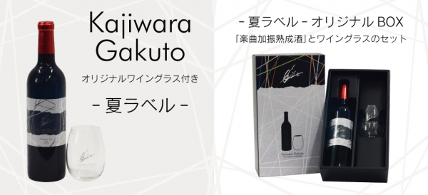 今回のワインの特徴ですが、「山ソーヴィニヨン」を主体にした赤ワインで、梶原岳人の楽曲「色違いの糸束」※2をワイン樽に取り付けた加振器により、約半年間じっくり聴かせ熟成させました。当社技術ノウハウの証として、「Matured by Onkyo」が付与されております。また容量は720mlボトルで、アルコール分12%、春ラベルは華やかなデザインを用いており、夏ラベルは涼しげなクールなデザインとなっております。豪華特典として『梶原岳人』サインを複写したオリジナルワイングラスを付属。オリジナル豪華パッケージ(BOX箱)となっております。