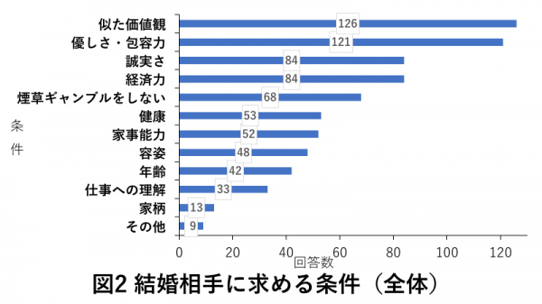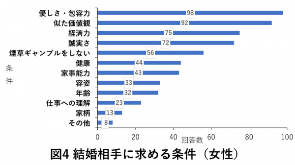 男性女性いずれも「優しさ・包容力」と「似た価値観」の回答数が多くみられましたが、「経済力」と「容姿」に関しては性差が大きく表れています。
