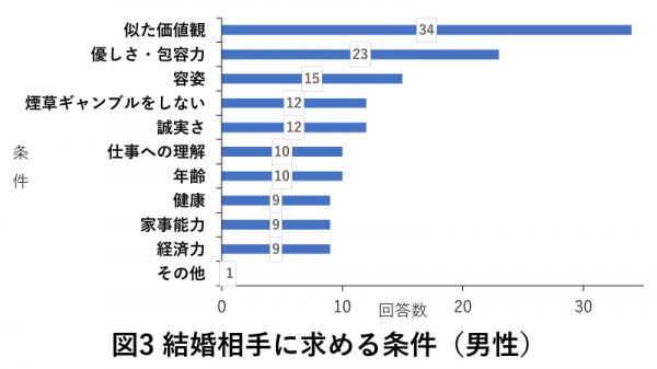 男性は容姿を条件とする方が多いのに対し経済力の回答は少なめ。一方、女性は経済力の回答が多いのに対して容姿を選択した方は全体に比べ少ない傾向にありました。