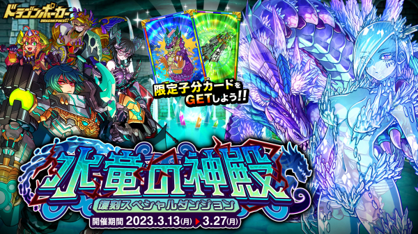 株式会社アソビズム(本社:東京都千代田区、代表取締役:大手智之)は、App Store・Google Playにて好評配信中のリアルタイム合体カードバトル『ドラゴンポーカー』で、2023年3月13日(月)より復刻スペシャルダンジョン「水竜の神殿」を開催いたします。