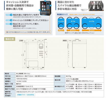 卓上自動販売機「卓っくん」は、非冷(常温)で屋内専用の卓上自動販売機で、キャッシュレス対応となっており、非対面、非接触で商品を購入することができます。さらに商品に合わせたスパイラル搬出技術に加え、取り出し口も大きくしたことにより、コンパクトながら多彩な商品の販売が可能です。今後は、ホテルや病院、オフィスをはじめ、コンビニエンスストア、さらには鉄道やバス、アミューズメント施設など、小スペースでの有効な活用が見込まれます。