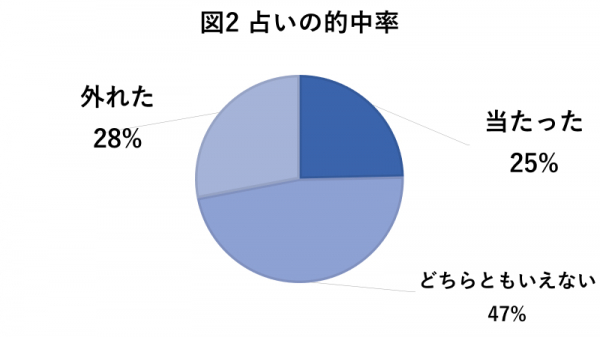 占いを受けた結果、当たったかどうかアンケートにて回答を求めたところ「当たった」という回答は25%、「どちらともいえない」が47%、「外れた」との回答が28%という結果に。