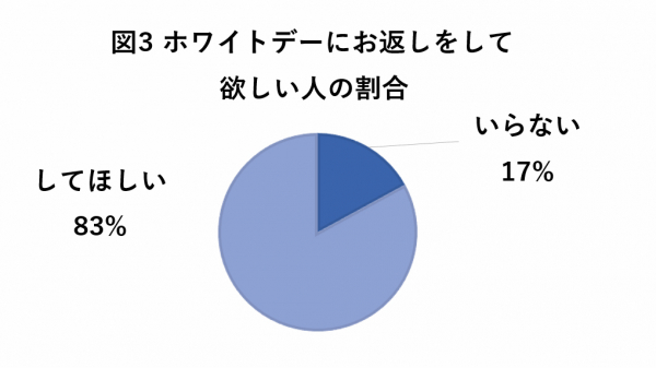ホワイトデーのお返しについての調査では、「してほしい」が83%、「いらない」が17%。