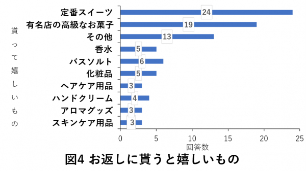 お返しに貰うと嬉しいものに関しては、1番目に多かったのが「定番スイーツ」、2番目に多かったのが「有名店の高級なお菓子」。