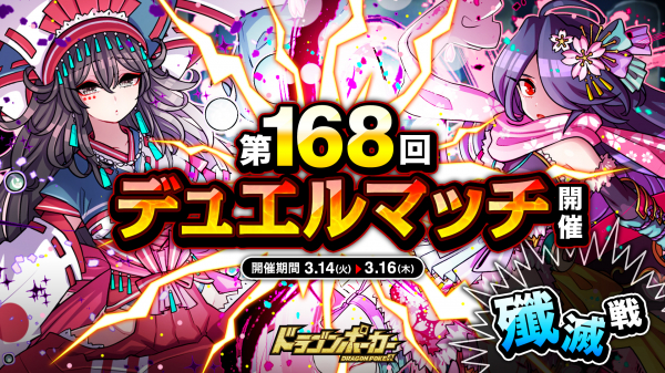 株式会社アソビズム(本社:東京都千代田区、代表取締役:大手智之)は、App Store・Google Playにて好評配信中のリアルタイム合体カードバトル『ドラゴンポーカー』で、2023年3月14日(火)より「第168回デュエルマッチ本戦」を開催いたします。