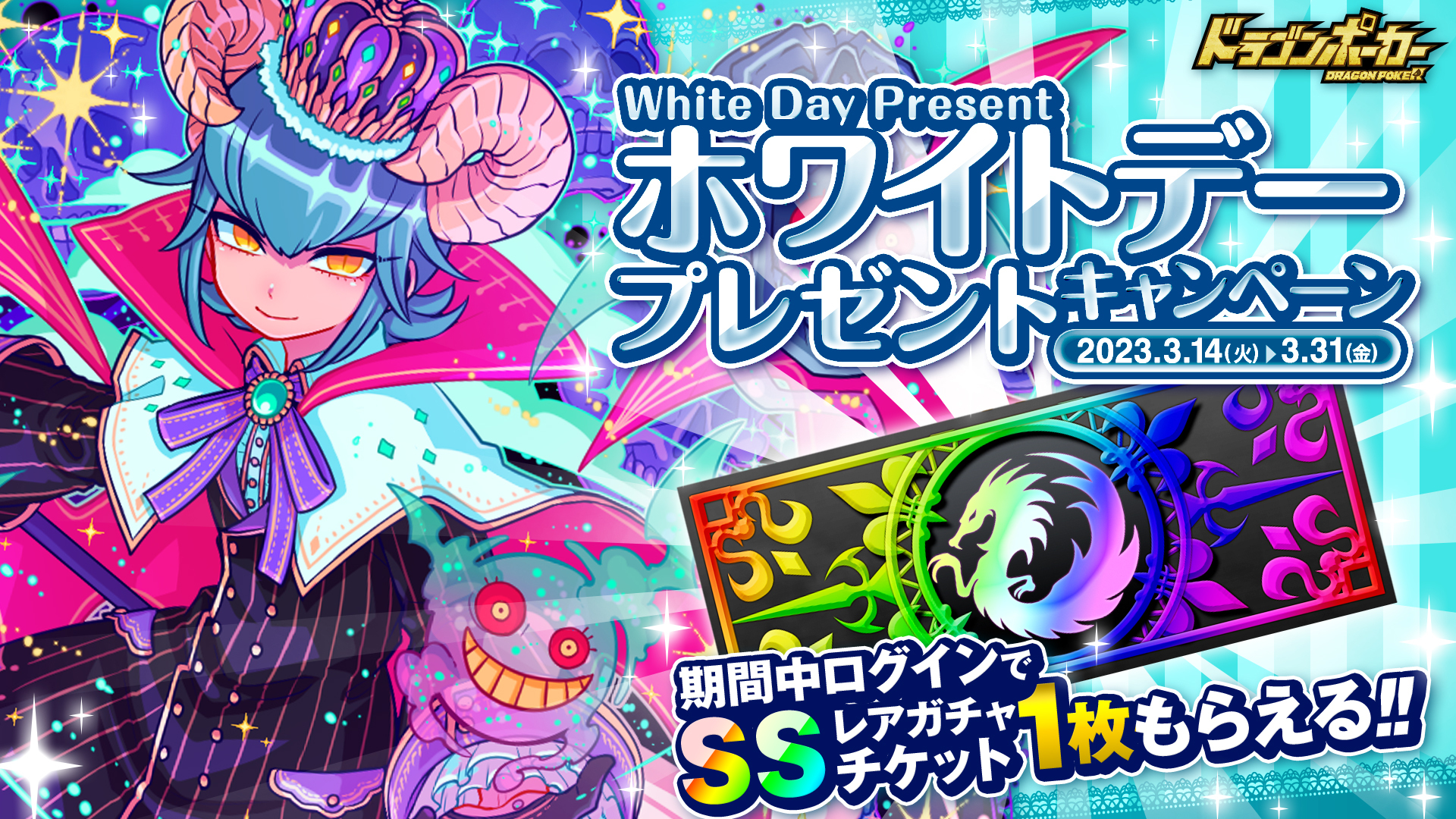 また、ホワイトデー特別企画として「ホワイトデープレゼントキャンペーン」も同時開催いたします。期間中にログインしたユーザー全員を対象に、SSレアガチャチケットをプレゼント!『ドラゴンポーカー』からのお返しを忘れずに受け取りましょう!