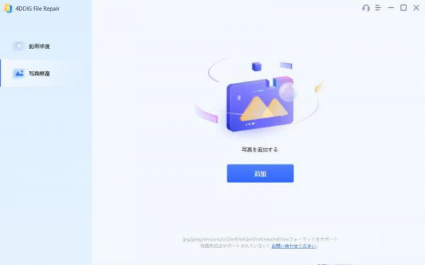 ステップ1:Windowsで4DDiG File Repairを起動して、ホーム画面で「写真修復」メニューを選んだら、「追加」ボタンをクリックします。