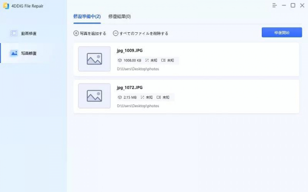 ステップ2:修復したい写真を選択して4DDiG File Repairにインポートしたら、「修復開始」をクリックします。