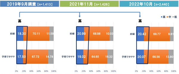 対して、コロナ流行後の2021年11月調査では、自己肯定感の高い妊婦さんは20.99%、子育て中ママは19.02%とやや増加傾向にあり、2022年10月調査では、妊婦さんは20.42%、子育て中ママ20.07%と、引き続き増加傾向にあることが分かる。
