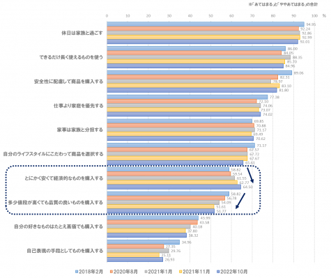 また、ライフスタイル・商品やサービス購入についての考え・意識・行動の変化では、「とにかく安くて経済的なものを購入する」割合が上昇傾向にあり、「多少値段が高くても品質の良いものを購入する」割合は減少傾向にある。