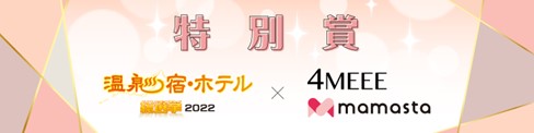 5省庁(環境省、内閣府、総務省、経済産業省、観光庁)の後援で観光地の活性化プロジェクトを実施している温泉宿・ホテル総選挙(主催:旅して日本プロジェクト、運営事務局:一般社団法人日本エンパワーメントコンソーシアム、本社:東京都渋谷区)は、オフィシャル応援メディアである『4MEEE(フォーミー)https://4meee.com/』(運営会社:4MEEE株式会社(所在地:東京都新宿区、代表取締役:尾久一也)とともに、温泉宿の取り組みを評価する「4MEEE賞」を3月15日(水)に発表いたしました。(https://yado.onsen-ouen.jp/category_select_2022/#specialprize)