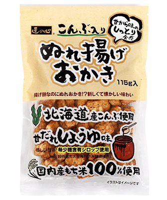 昆布の旨味がたっぷりな一口サイズの揚げ餅に、甘から醤油ダレが“しっとり”と染み込んだ、どこか懐かしくも新しい“ぬれ食感”の揚げおかきです。