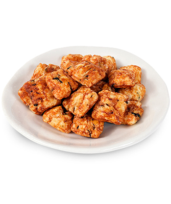 甘から醤油タレには、低GI甘味料・希少糖ベースのシロップを使用し、日本人に昔から馴染み深い“甘から味”を追求しました。お年寄りからお子様まで、幅広い年齢層に好まれる味と食感の揚げ餅です。