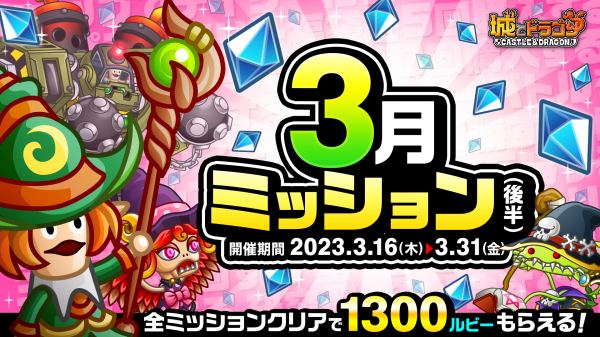 株式会社アソビズム(本社:東京都千代田区、代表取締役:大手智之)は、App Store・Google Playにて好評配信中の『城とドラゴン』で、「3月ミッション(後半)」を2023年3月16日(木)より開催いたします。