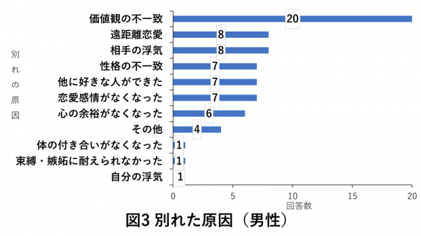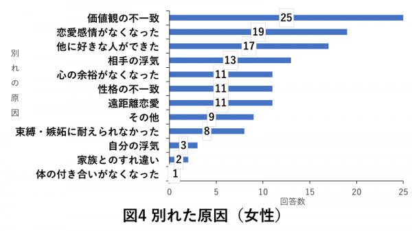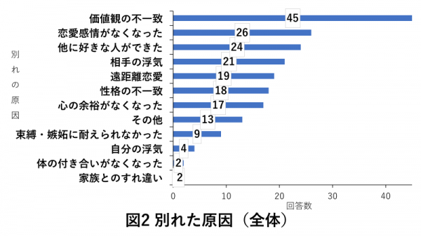 男女で比較したところ、男女共通して「価値観の不一致」の回答がトップ。