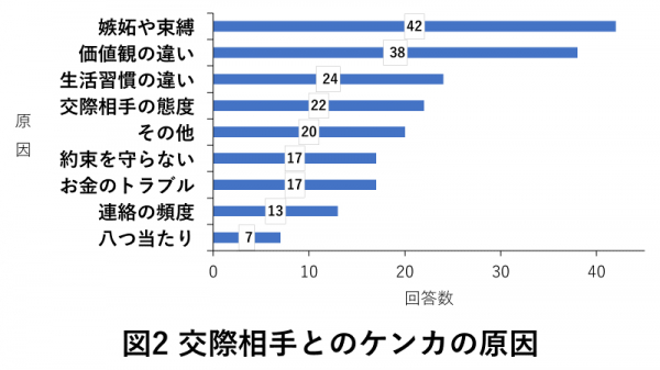 ケンカの原因では、「嫉妬や束縛」を選択された方が最も多く、次に「価値観の違い」が選ばれていました。