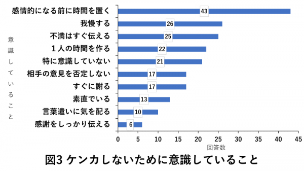 ケンカしないために最も意識しているポイントについては、「感情的になる前に時間を置く」との回答が多数。