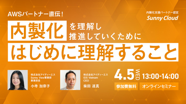 アマゾンウェブサービス(以下:AWS)のアドバンストティア サービスパートナーであるサニークラウド(運営会社:株式会社アイディーエス、本社:東京都港区、代表取締役:中野 貴志、以下アイディーエス)は、4月5日(水)にAWS認定内製化支援パートナーによるシステム開発の内製化をテーマにしたウェビナー「内製化を理解し推進していくために、はじめに理解すること」を開催いたします。