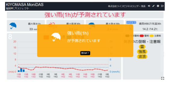 現場ピンポイントの気象情報を提供している「KIYOMASA PRO」の情報を、大型モニターやPCなどにダッシュボード形式で常時表示することができ、さらにポップアップや音声で警告を発報します。