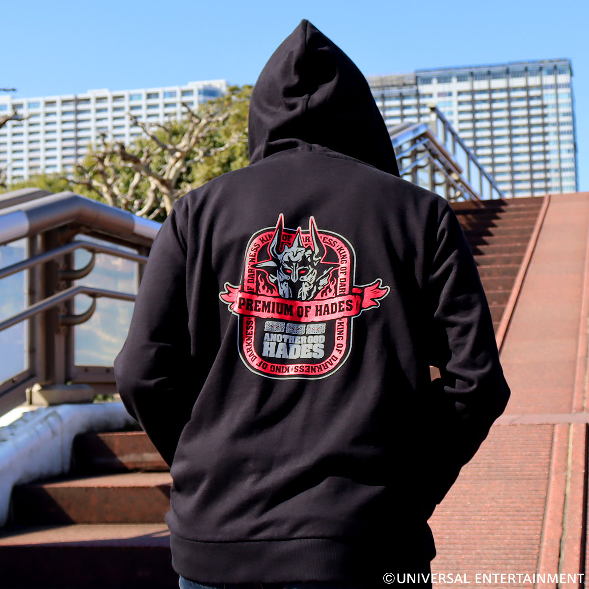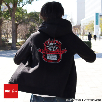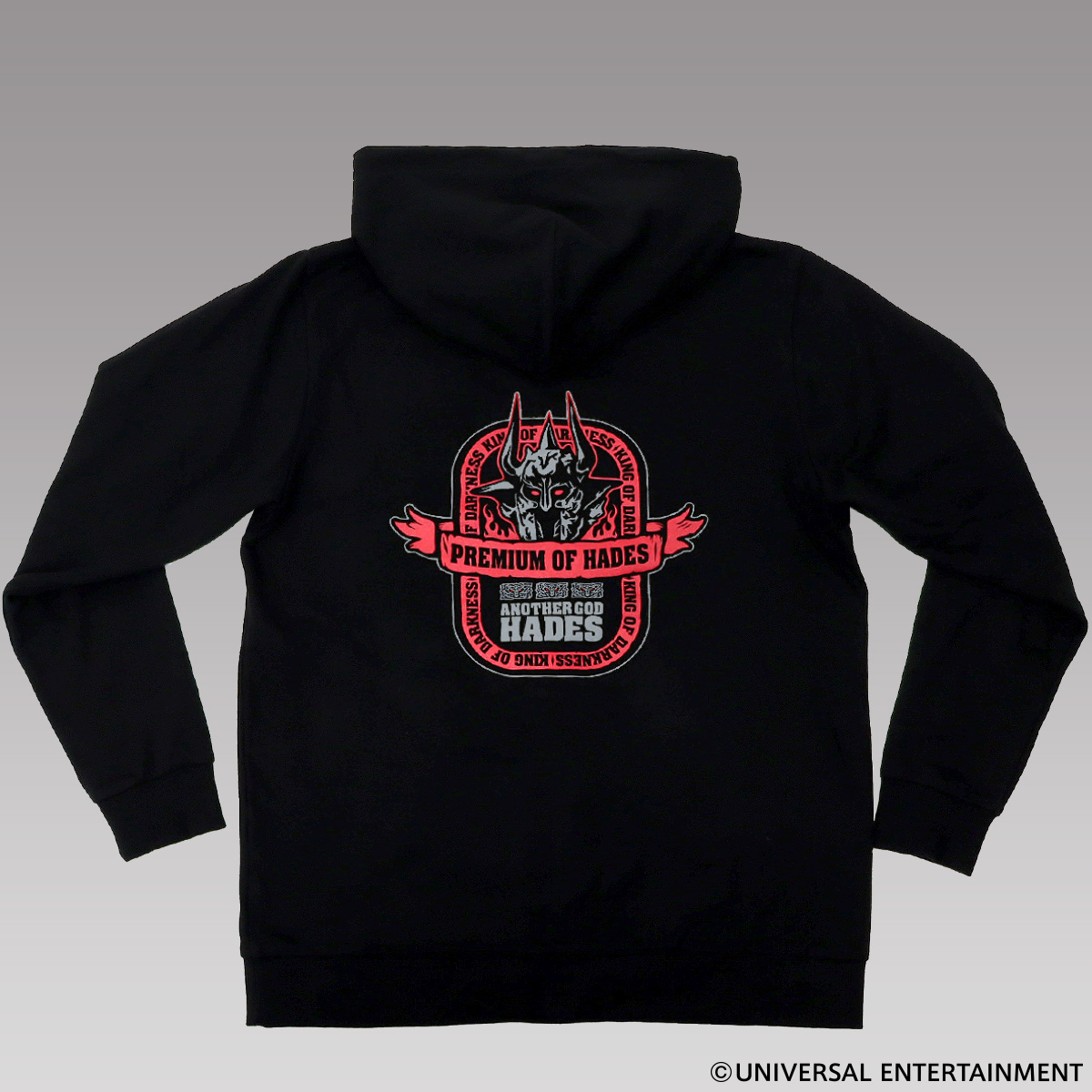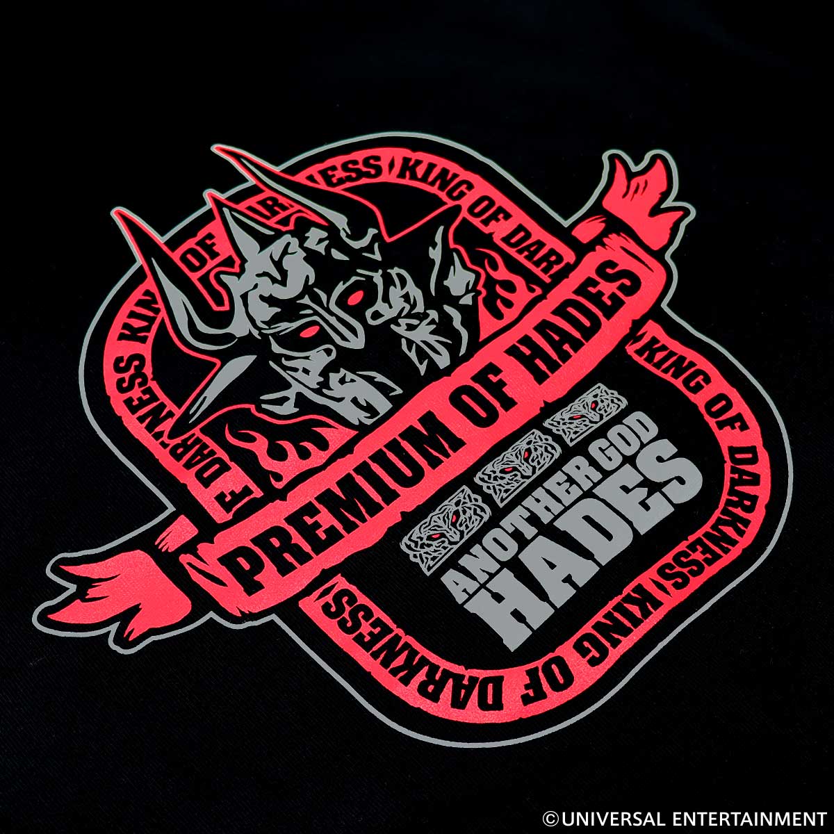 バックは赤とグレーでまとめたハーデスのデザイン、フロントは胸元に冥王図柄とロゴをワンポイントであしらいました。