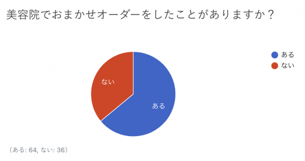 美容院でおまかせオーダーをしたことがあるかについて、「ある」が64%、「ない」が36%となり、『6割以上の人が美容院でおまかせオーダーをしたことがある』という結果でした。