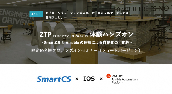 株式会社エーピーコミュニケーションズは、2023年4月19日(水)に「ZTP(ゼロタッチプロビジョニング)体験ハンズオン-SmartCSとAnsibleの連携による自動化の可能性-(ショートバージョン)」をセイコーソリューションズ株式会社と合同で開催いたします。