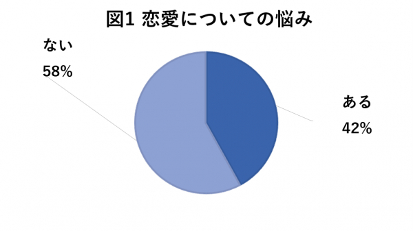 恋愛について悩みがあるかどうか調査したところ、「ある」と回答した方が42%、「ない」と回答した方が58%という結果になりました。