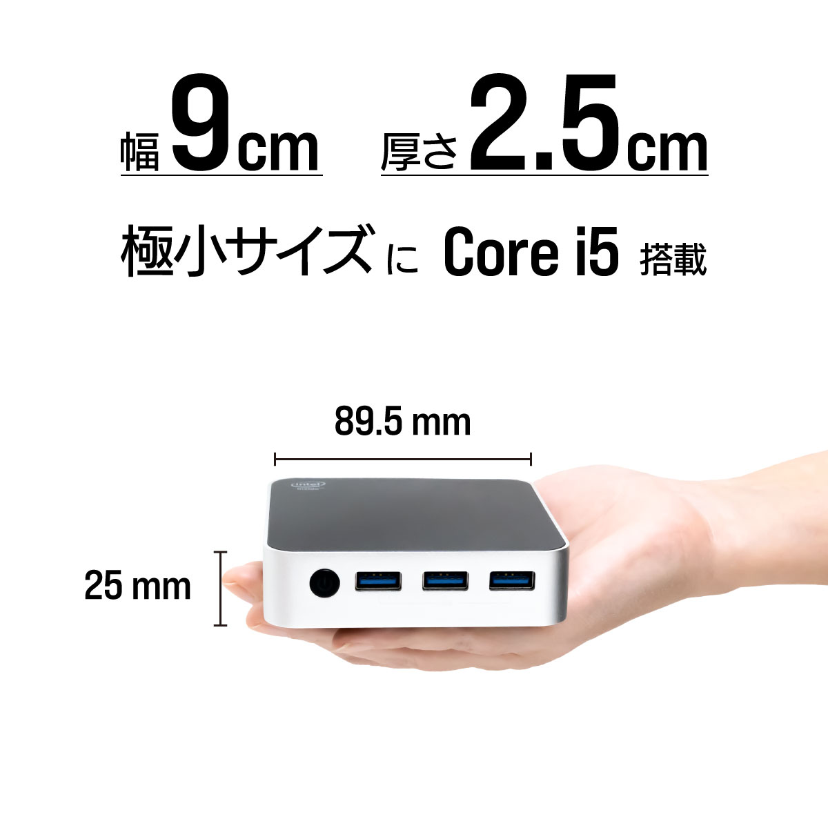 LZ16Jは4コア8スレッドの高性能CPU、Intel(R) Core(TM) i5-1030NG7を搭載した、わずか0.2 LサイズのミニPCです。9 cm未満の筐体に16 GBメインメモリ、512 GB M.2 NVMe SSDを搭載しています。4K / 60 fps、デュアルモニタ出力に対応するHDMI 2.0のほか、USB Type-C、有線2.5G LANポート、microSDカードスロットを備え、モニター裏に固定できるVESAマウンタが付属します。場所を取らずにリビングPCや在宅ワークなどに活用できます。