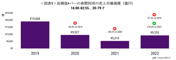 2022年計の居酒屋+バーの市場規模は9253億円で前年比74.3%増と、大幅な増加となりました(図表1)。しかし、2019年比では51.5%減で、コロナ前から半減したままでした。
